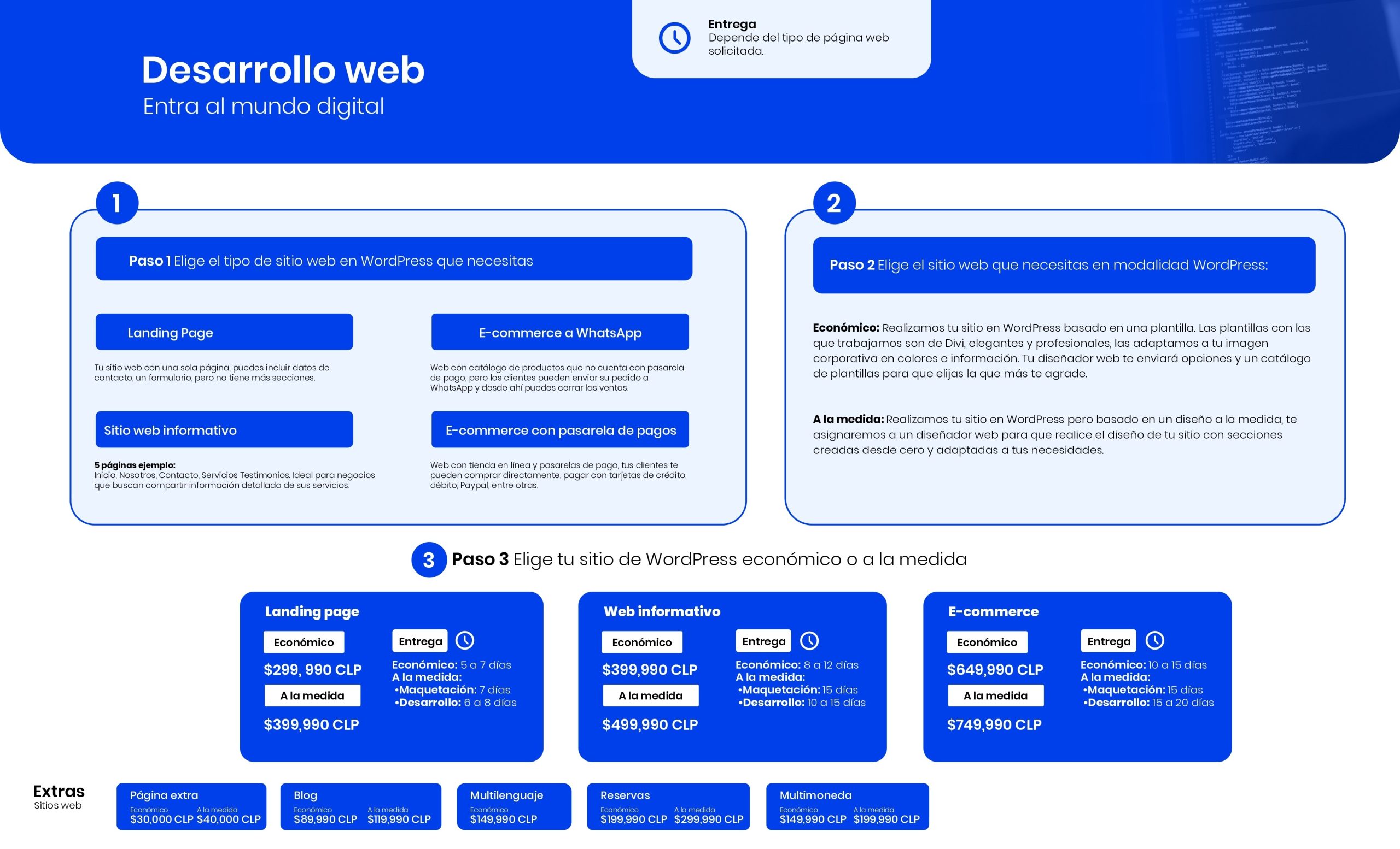 - Diseño Web Inicial (One page) – desde $299.990 hasta 399.990: Ideal para quienes desean una presencia inicial pero efectiva en la web. Incluye una página de aterrizaje con diseño profesional, integración con redes sociales, botones de contacto y configuración de herramientas esenciales de marketing digital como Google Ads y Pixels de redes sociales.